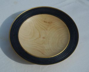 This shallow bowl or dish is one of those that I have actually finished. Made from rippled sycamore, with a very classical, simple, elegant shape, a few beads as decoration on the rim, and some blue and gold accents to frame the actual bowl in the centre. None of this was planned or designed, it just happened.
